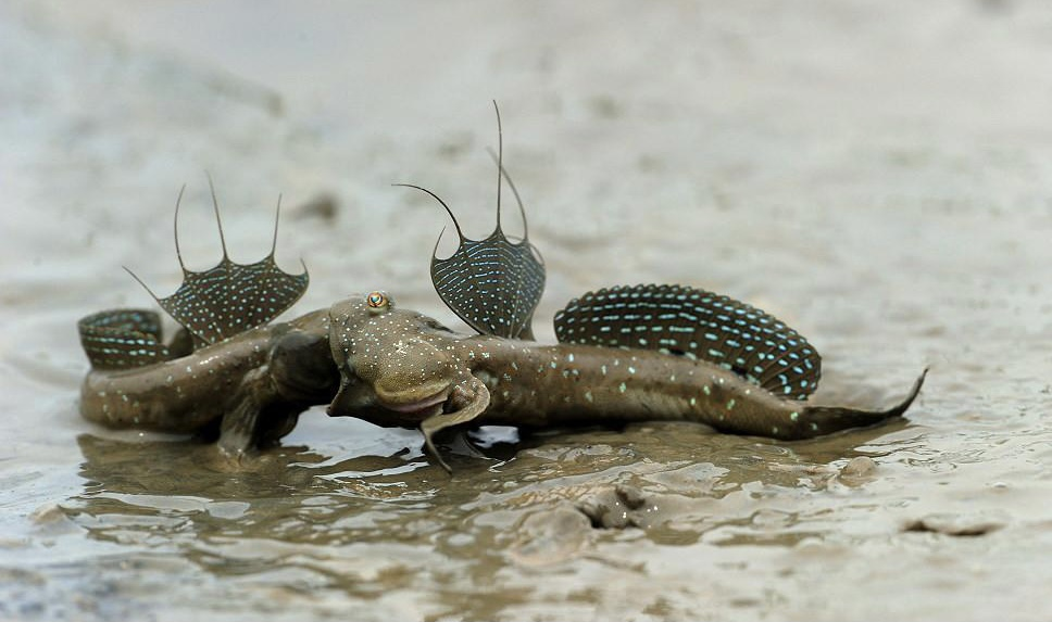 湿润绵软的滩涂上,弹涂鱼(俗称跳跳鱼)一改鱼类的水生常态,近乎疯狂地爬行弹跳。作为从海洋爬向陆地的典型生物,它们拥有强劲有力的肌肉,然而,它们却没有“跳”出不法分子的围捕。弹涂鱼(俗称跳跳鱼)。