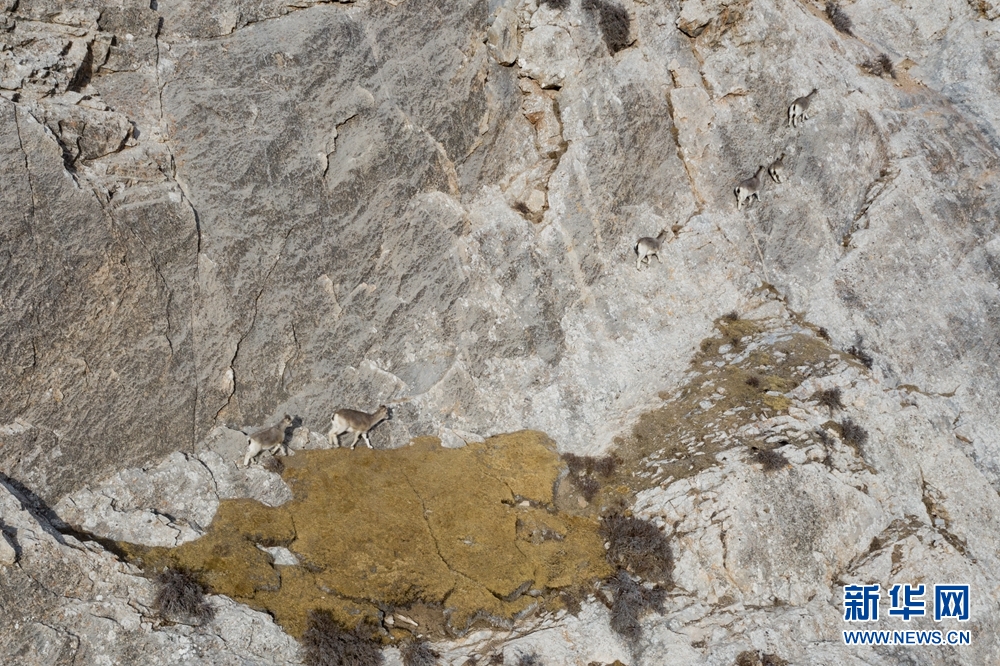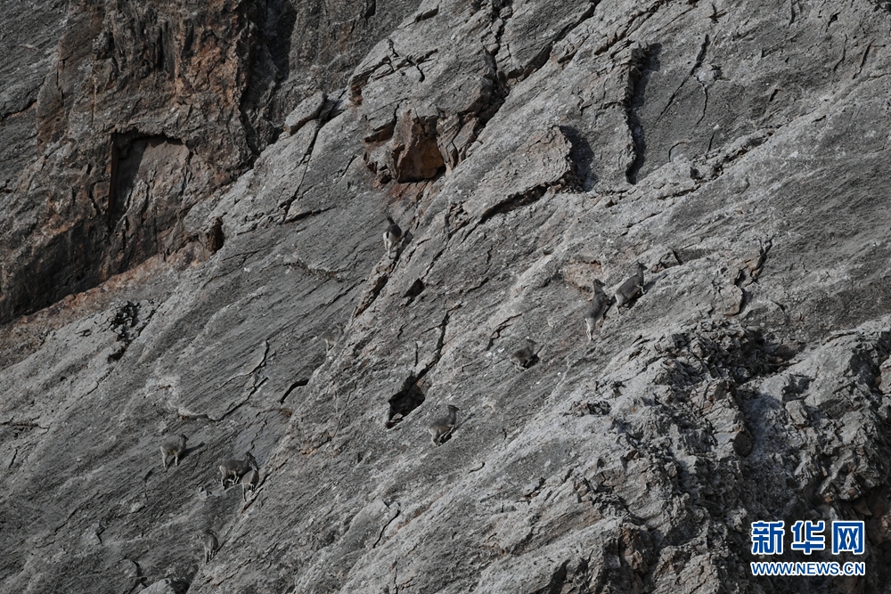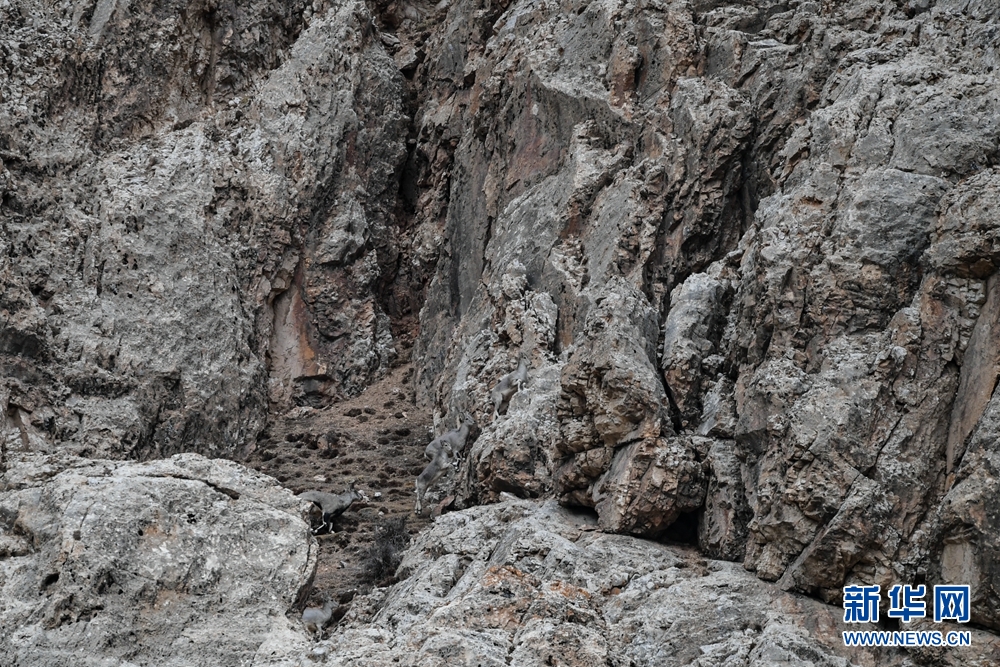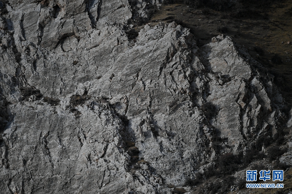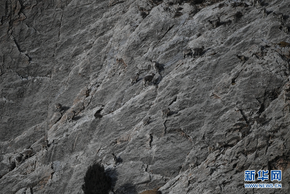 12月31日,在青海省海西蒙古族藏族自治州德令哈市柏树山森林地质公园内,一群岩羊在岩壁上嬉戏。