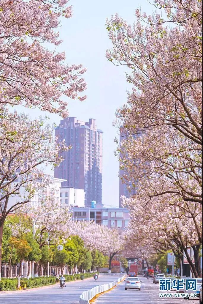 资料图:昆明市金兰路沿线街道两旁的泡桐花竞相绽放