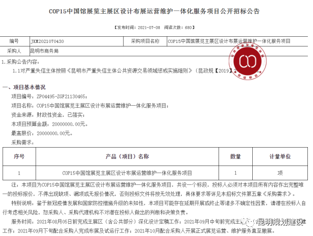 7月8日,昆明市商务局发布了《生物多样性公约》第十五次缔约方大会(COP15)中国馆展览主展区设计布展运营维护一体化服务项目公开招标公告。