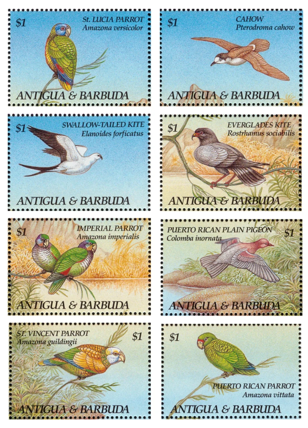 安提瓜和巴布达1993年4月5日发行《濒危物种》邮票。依次为:圣卢西亚鹦哥、百慕大圆尾鹱、燕尾鸢、食螺鸢、帝王鹦哥、纯色鸽、圣文森特鹦哥、波多黎各鹦哥。秘境百马供图