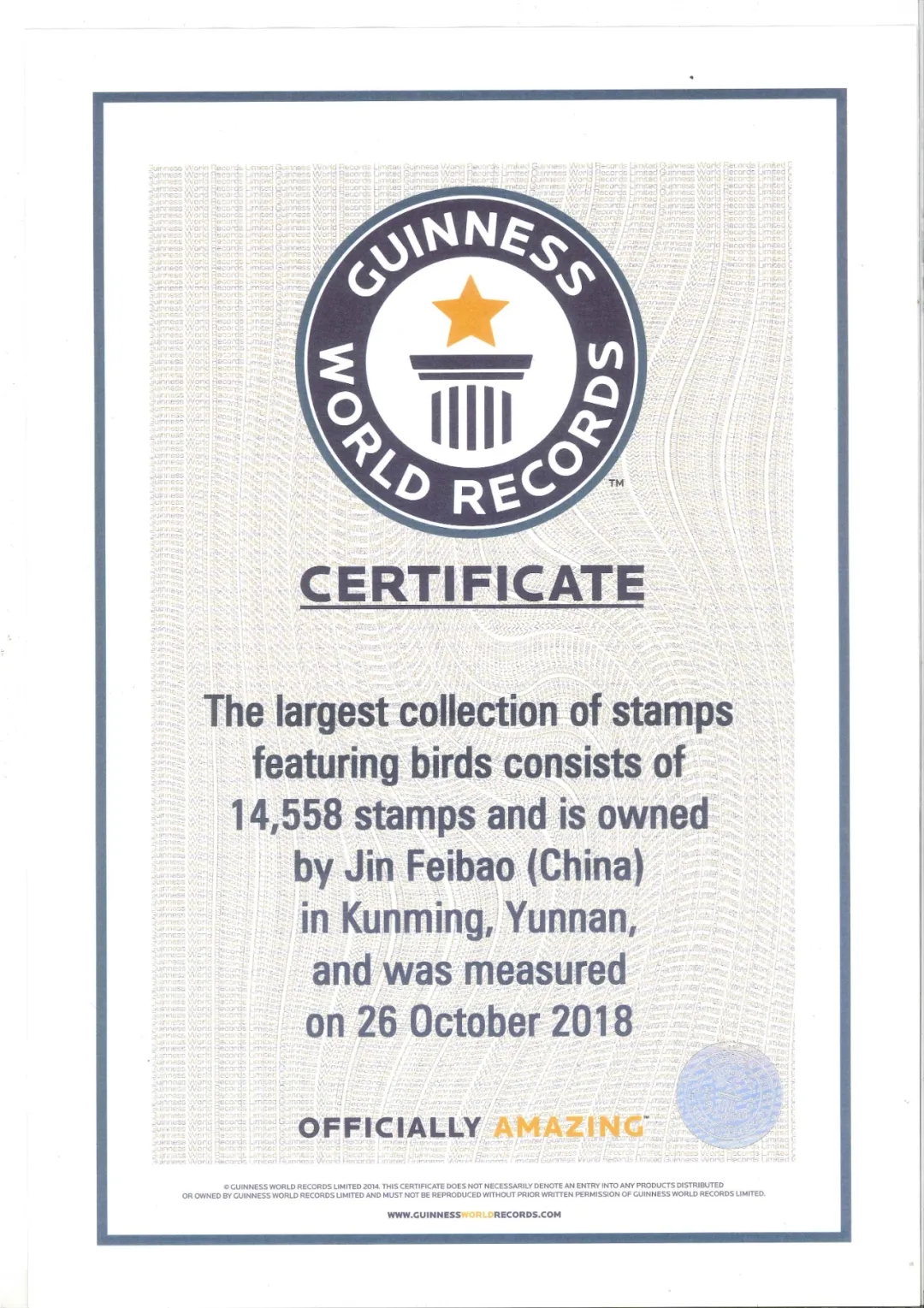 直至2018年,金飞豹潜心收集的14558枚鸟类邮票,获得了吉尼斯世界纪录“世界最全鸟类邮票”认证。获得殊荣后,仍然没能停下金飞豹继续扩充鸟类邮票收集的脚步,在联合国《生物多样性公约》第十五次缔约方大会即将在昆明召开之际,当金飞豹重新梳理这套已经扩充至16500枚的邮票时,意外地发现,在其所涉及的全球315个国家、地区及海外属地中,尽然毫无遗漏的包含了《生物多样性公约》中所有196个缔约方(其中欧盟未发行过邮票)所发行的鸟类邮票!