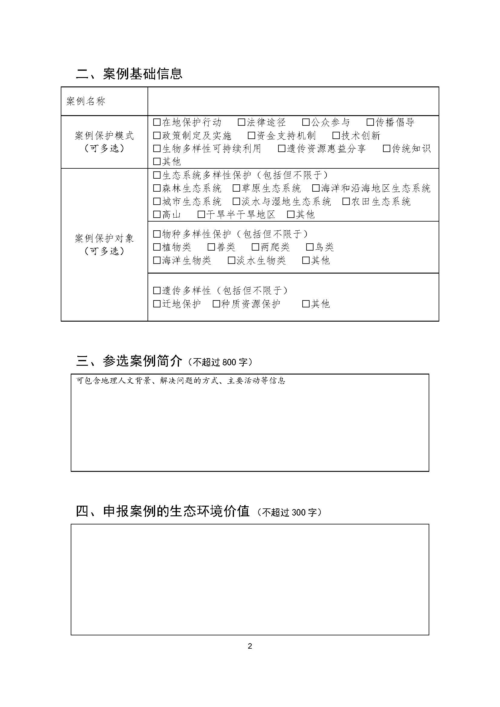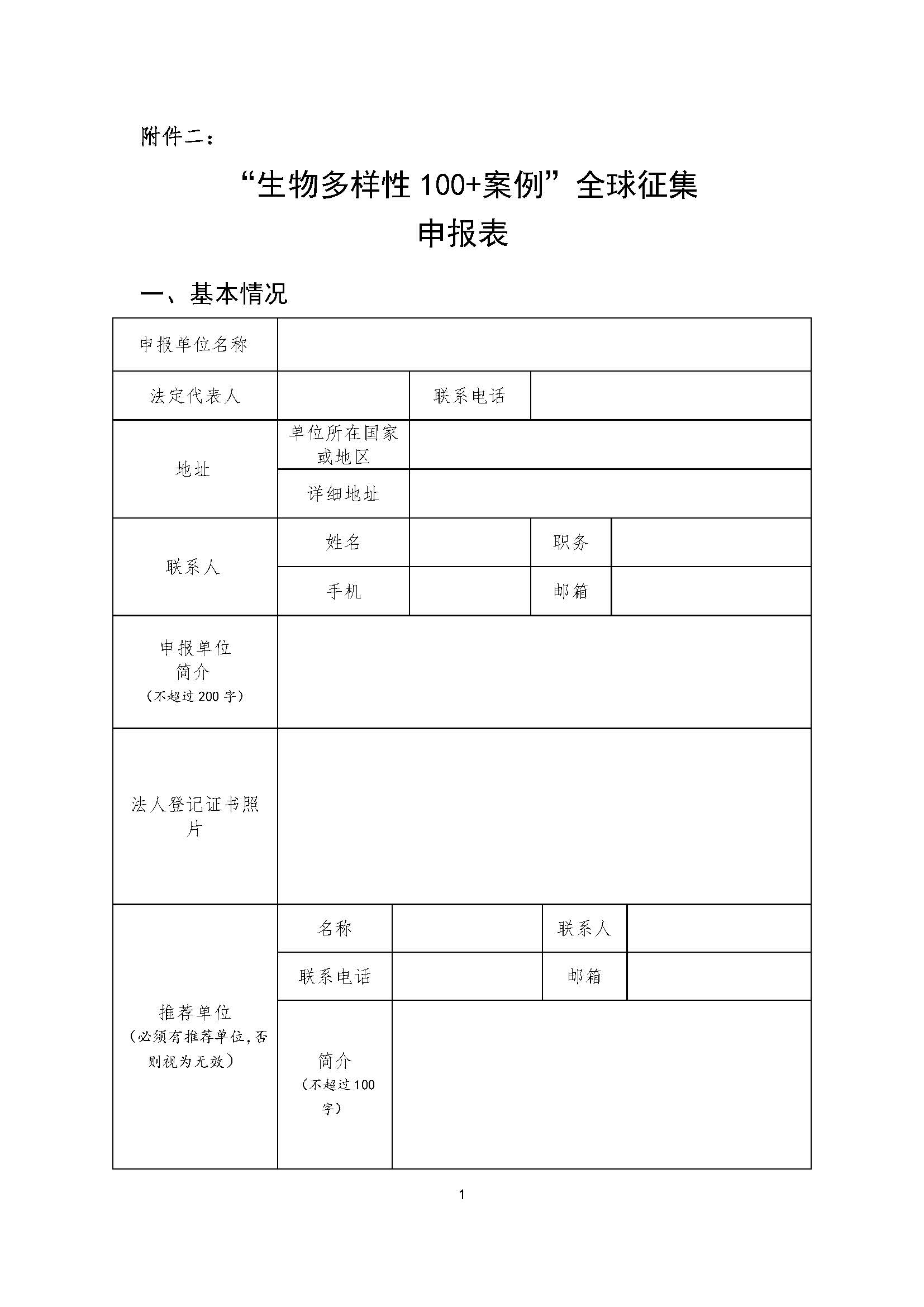 附件二:“生物多样性100+案例”全球征集活动 申报表(打印附件二并填写)