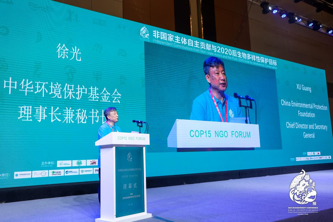 非国家主体自主贡献倡议签约活动作为闭幕活动,将两天的论坛推向了高潮。论坛承办机构代表中华环境保护基金会理事长徐光在闭幕式总结致辞当中表示,本次论坛在议题响应了全球生物多样性保护的核心关切,并呼吁非国家主体的利益相关方继续凝聚共识、携手同行,为COP15正式会议在昆明成功召开和早日实现全球人与自然和谐共生的愿景作出积极贡献。