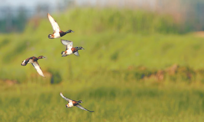 武汉府河湿地,飞翔的青头潜鸭。谭 军摄