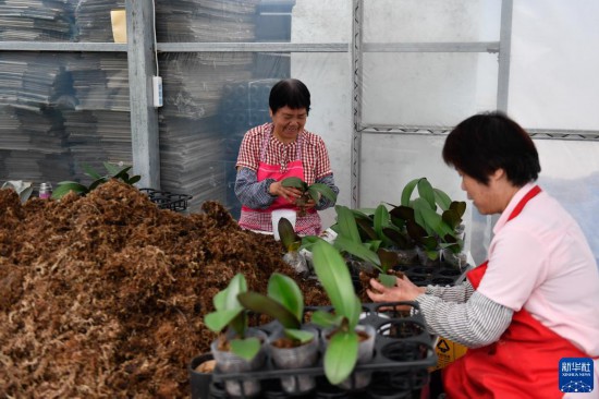 11月3日,在双浦镇一家现代农业产业园,在此就业的村民给花苗换盆。