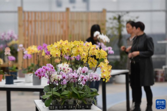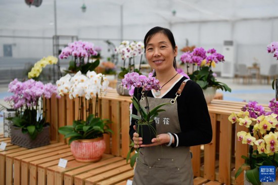 11月3日,在双浦镇一家现代农业产业园,工作人员展示一盆蝴蝶兰。