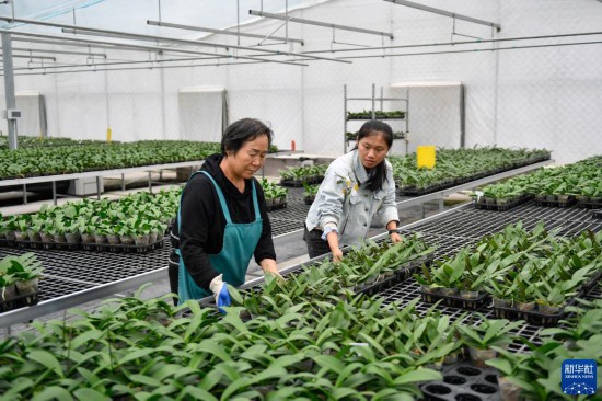11月3日,在双浦镇一家现代农业产业园,在此就业的村民在管护花卉幼苗。