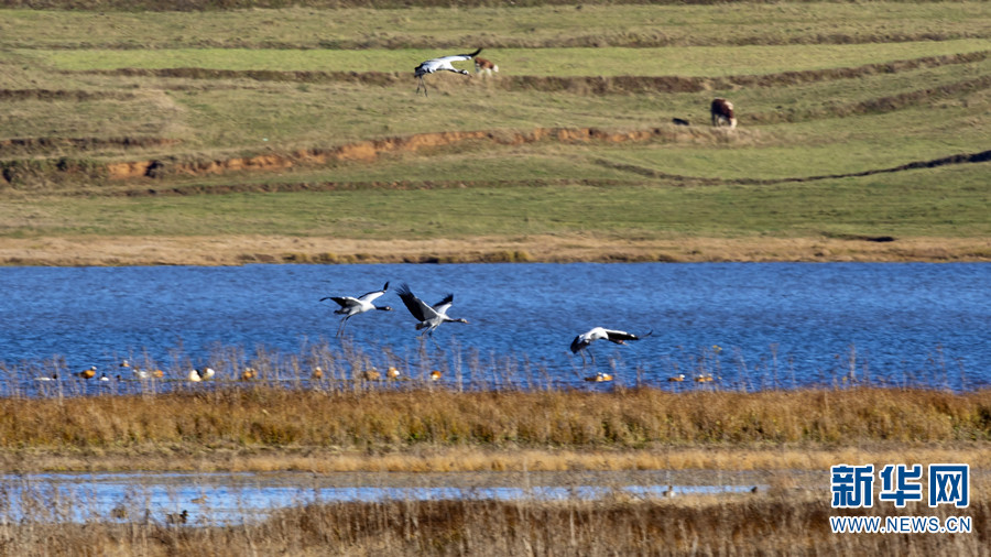 首批黑颈鹤到达大山包保护区开启越冬生活。此外,众多水鸟也如约而至(11月6日摄)。新华网发(王远剑 摄)