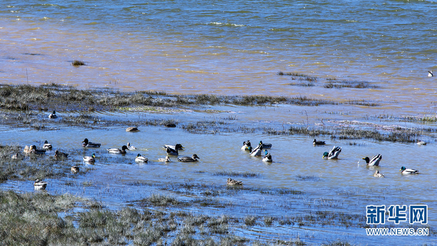 一群绿头鸭在大山包跳墩河湿地觅食(11月4日摄)。新华网发(王远剑 摄)