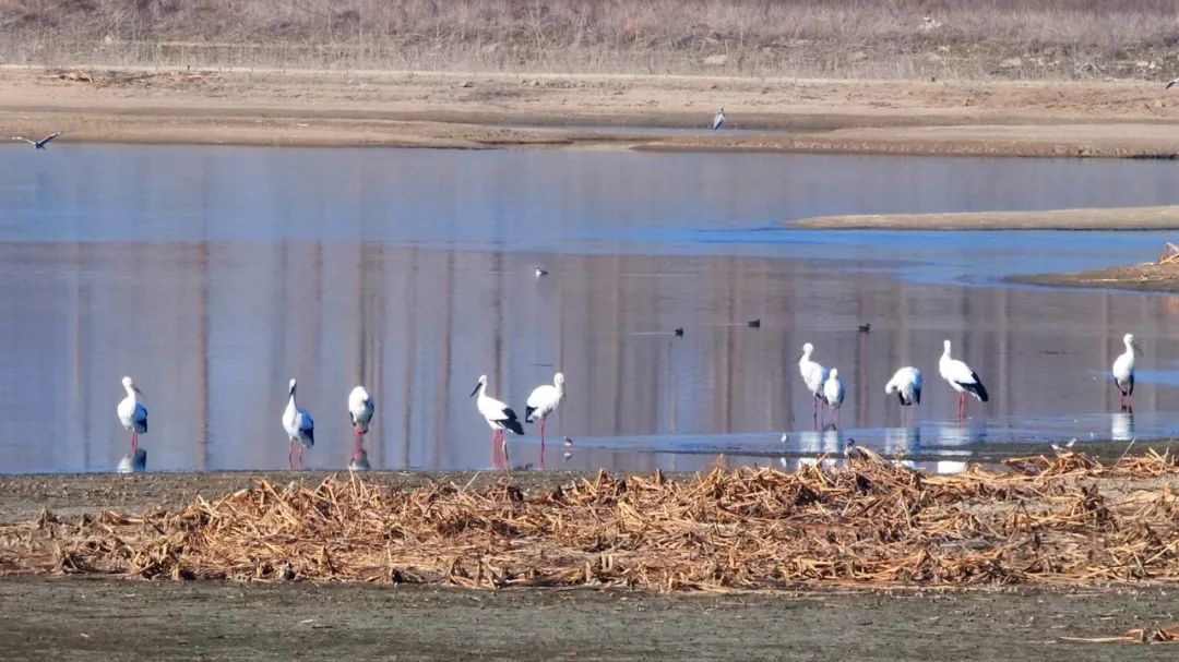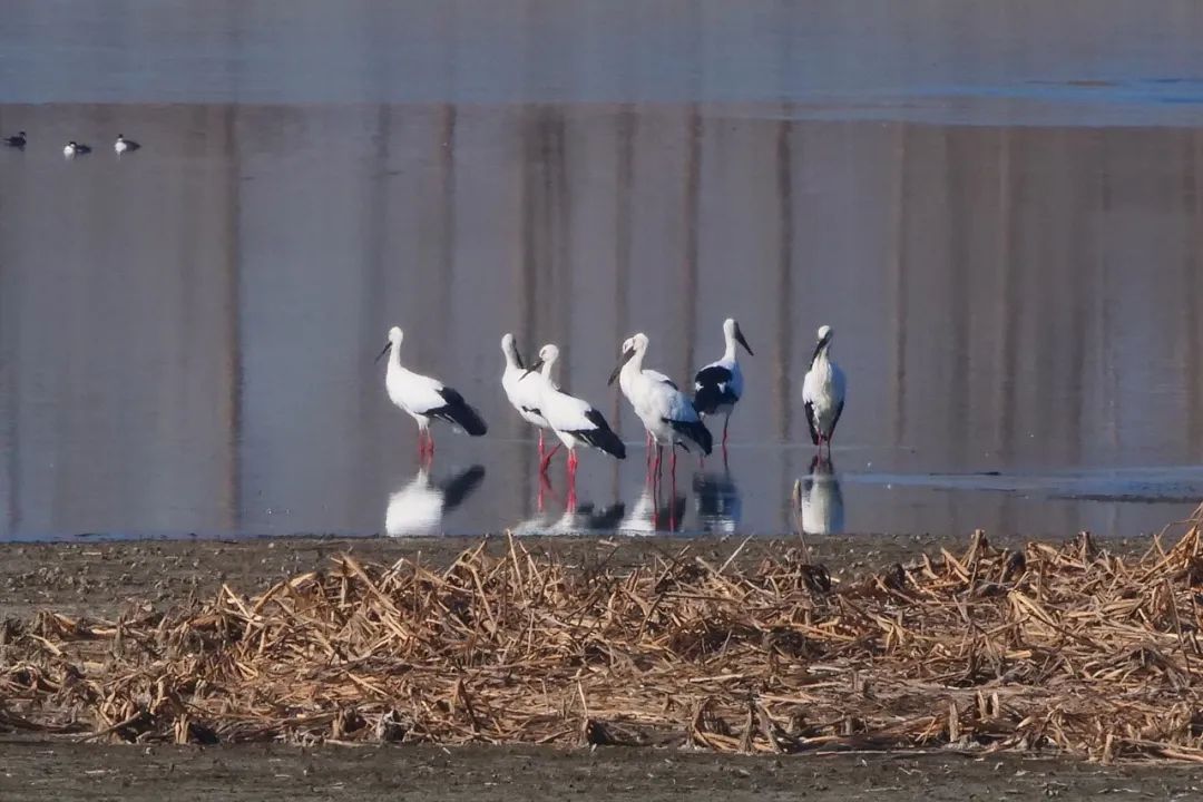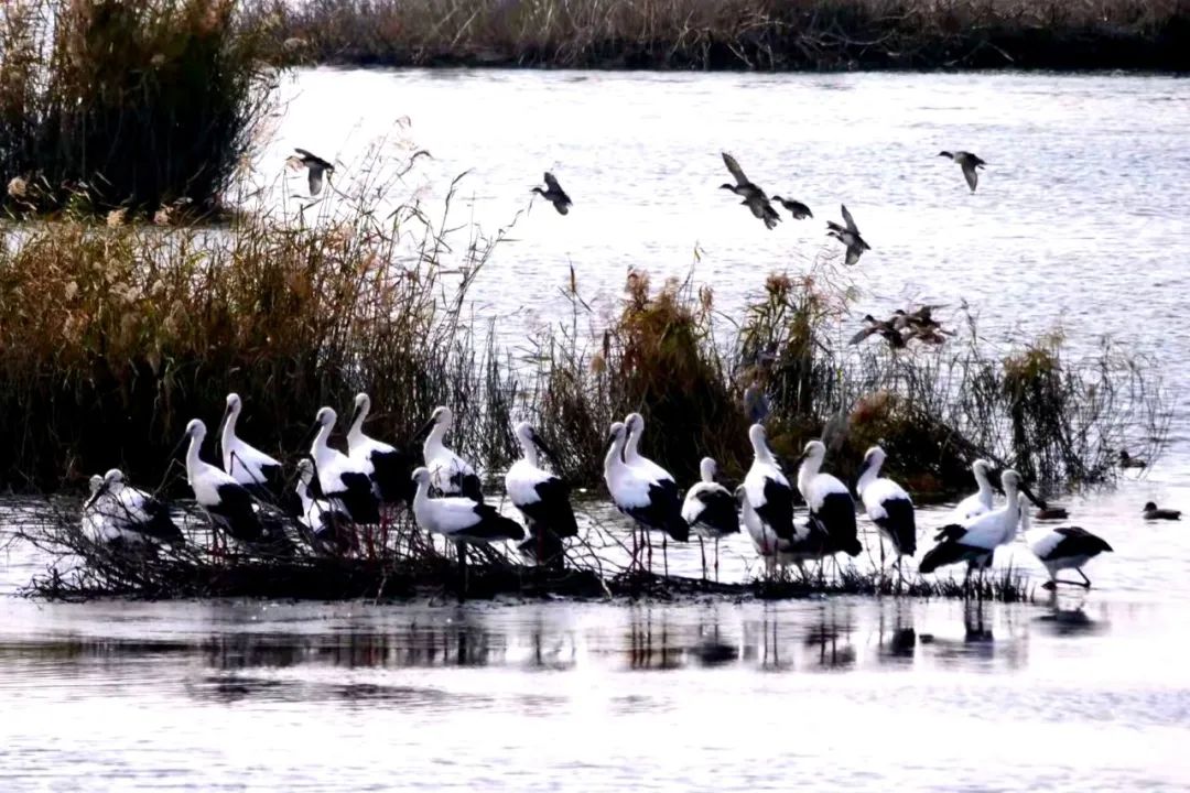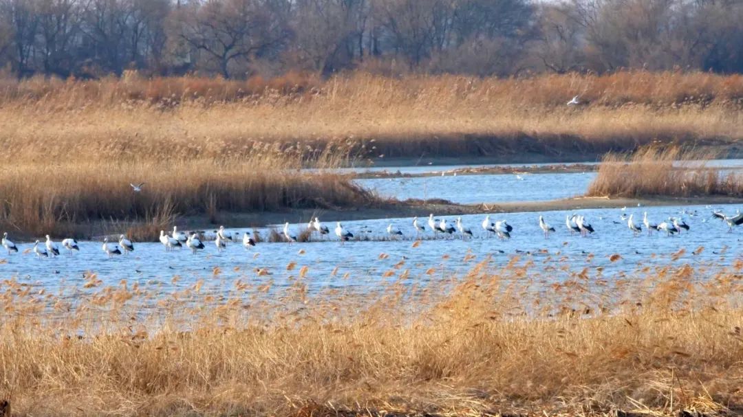 △20余只国家一级保护动物东方白鹳集结群