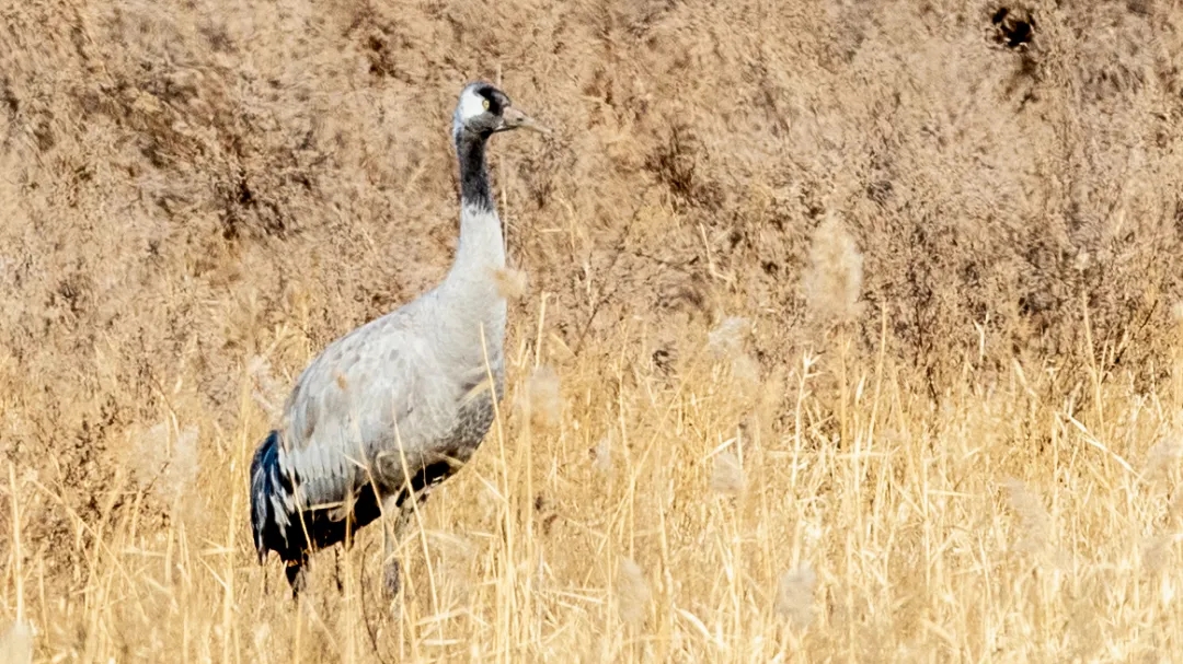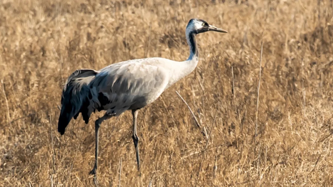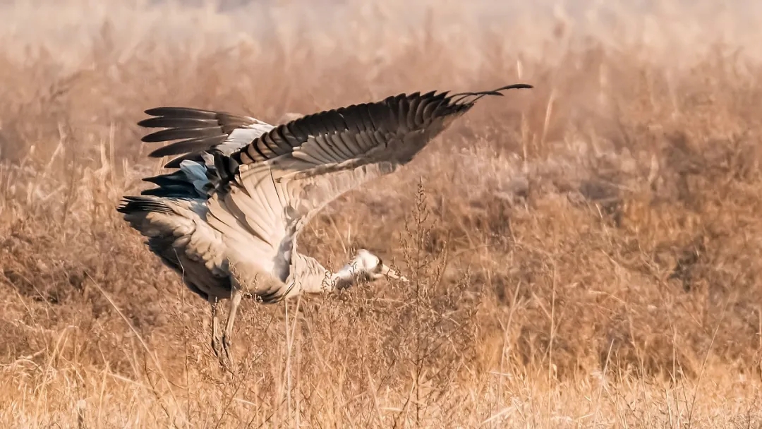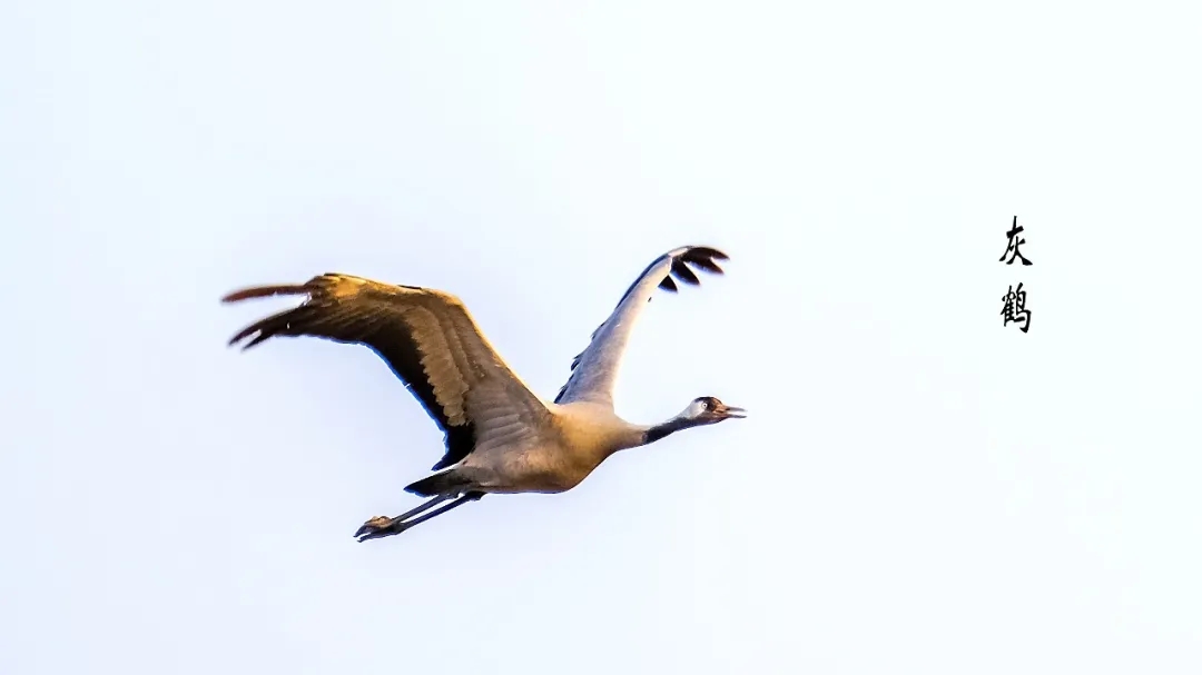灰鹤:是大型涉禽,体长100-120厘米。颈、脚均甚长,全身羽毛大都灰色,头顶裸出皮肤鲜红色,眼后至颈侧有一灰白色纵带,脚黑色。栖息于开阔平原、草地、沼泽、河滩、旷野、湖泊以及农田地带;其中尤为喜欢以富有水边植物的开阔湖泊和沼泽地带。主要以植物叶、茎、嫩芽、块茎、草子、玉米、谷粒、马铃薯、白菜、软体动物、昆虫、蛙、蜥蜴、鱼类等食物为食。春季于3月中下旬开始往繁殖地迁徙,秋季于9月末10月初迁往越冬地。