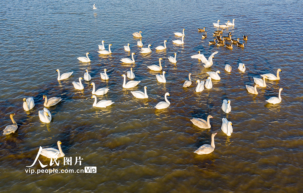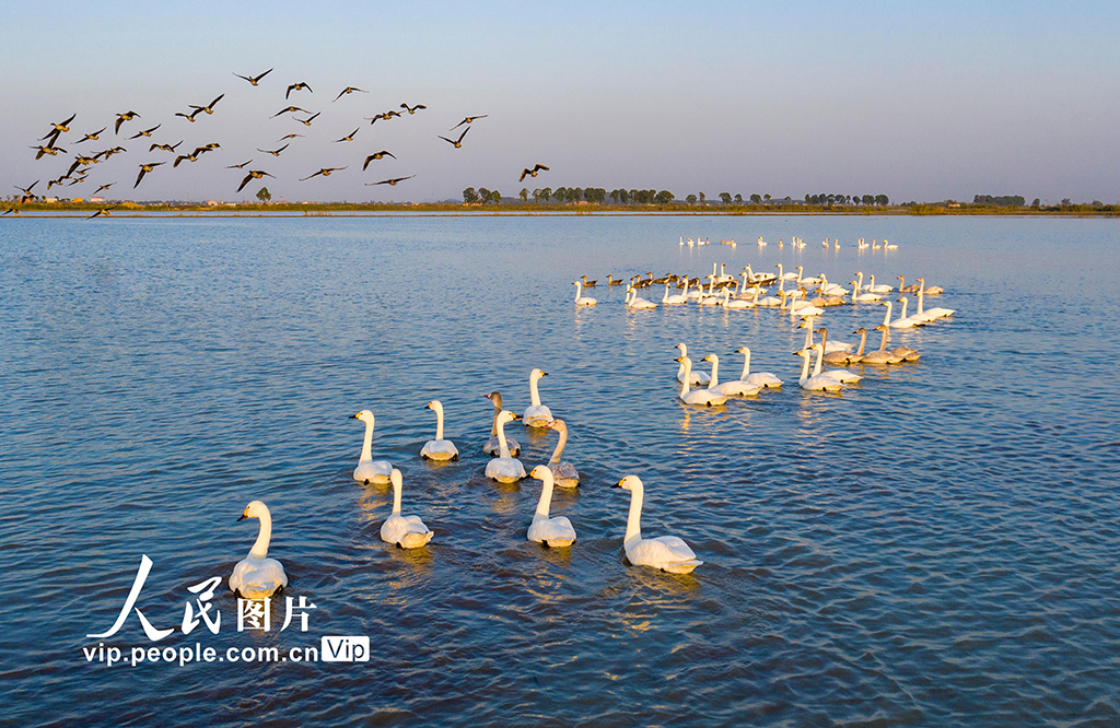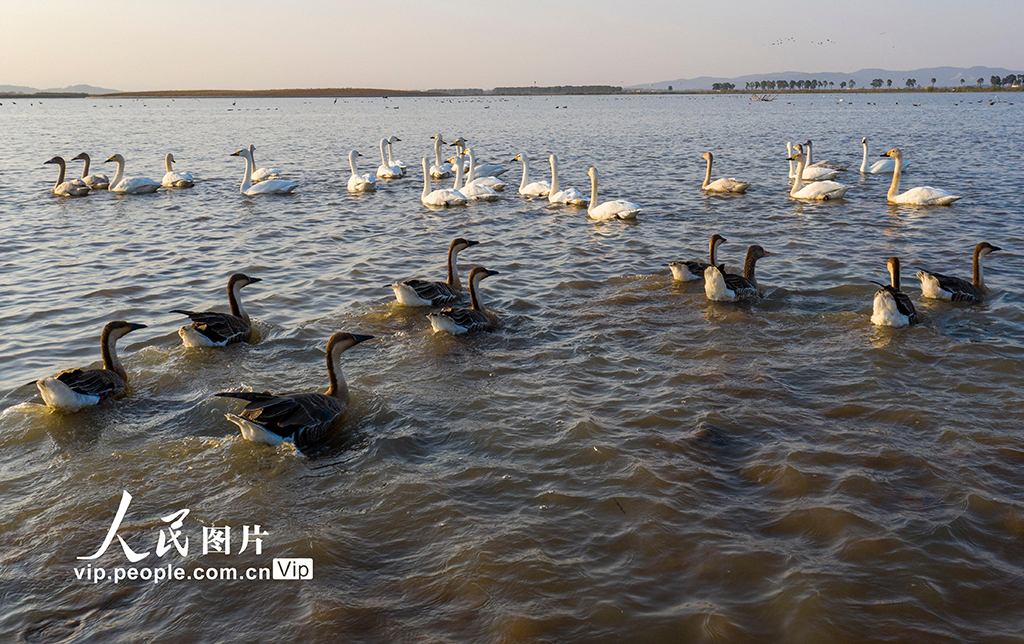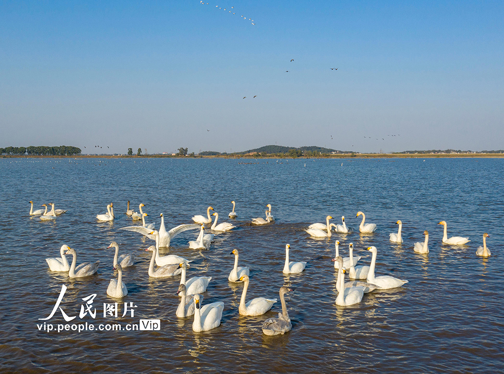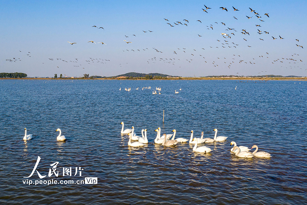 2021年11月13日,安徽省合肥市庐江县黄陂湖湿地,成群的天鹅、大雁等候鸟在湖面上、湿地里尽情嬉戏、自由飞翔。
