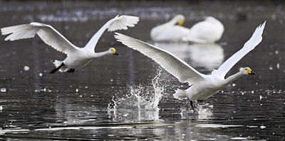 近年来,随着新疆巴音郭楞蒙古自治州库尔勒市生态环境的日益改善,越来越多的天鹅来到孔雀河、杜鹃河越冬,天鹅已成为库尔勒市的一道亮丽风景线。图为天鹅在库尔勒市孔雀河嬉戏。(确·胡热)