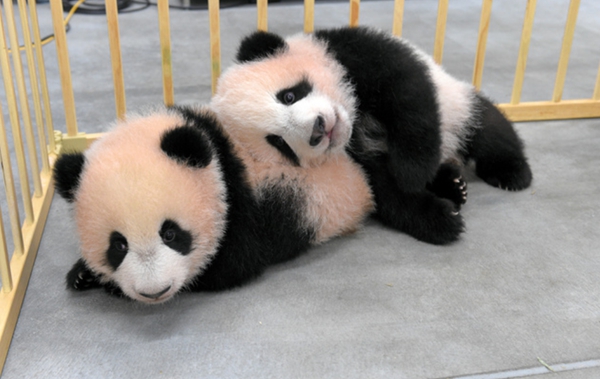 上野动物园发布双胞胎大熊猫最新萌照 体重已近10公斤