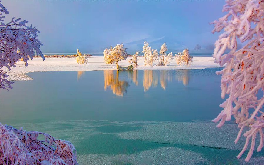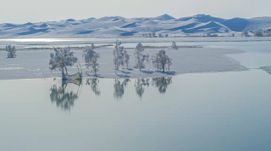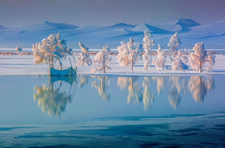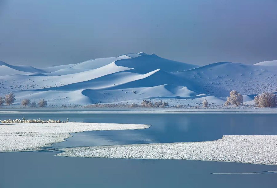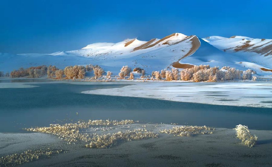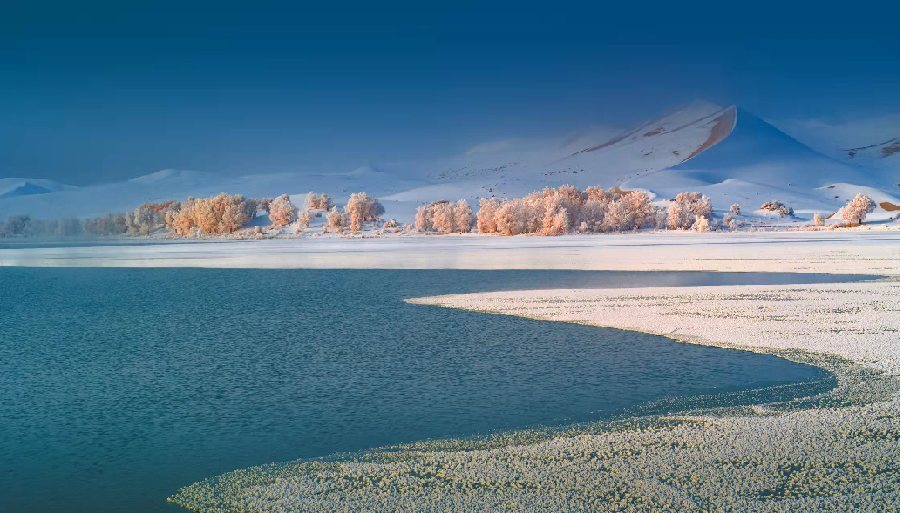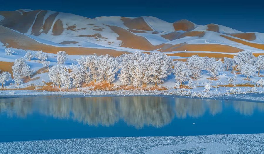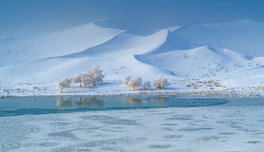 白雪、沙漠、湖泊、雾凇胡杨与蓝天相互映衬