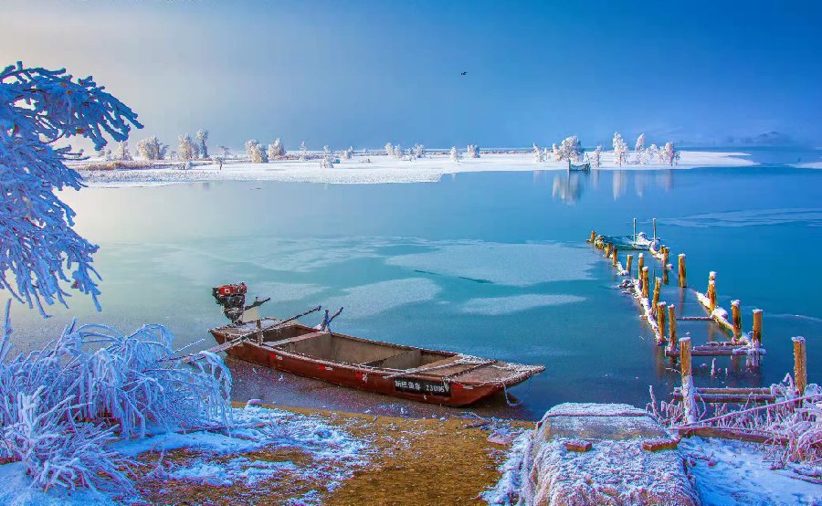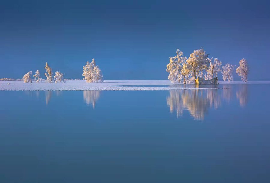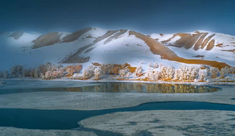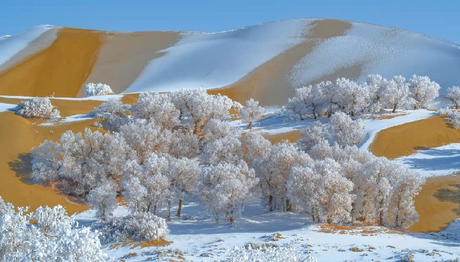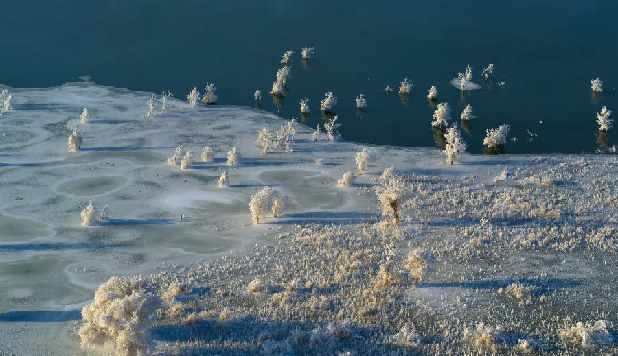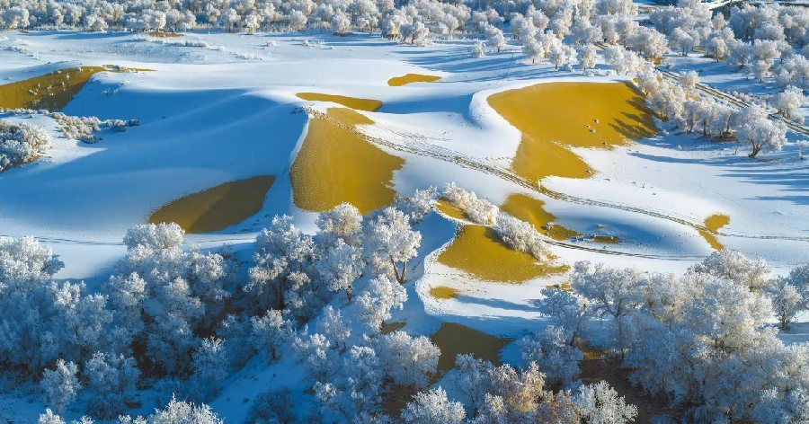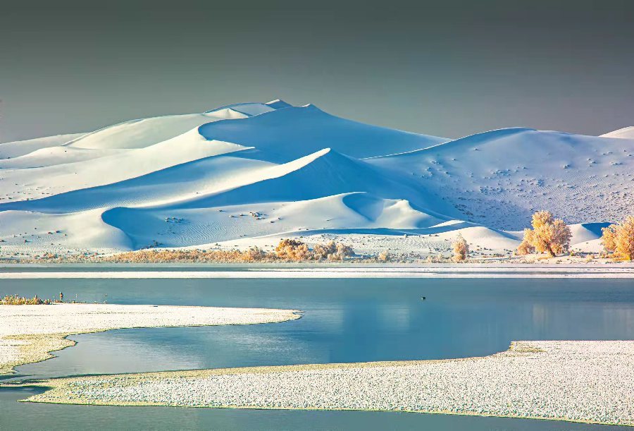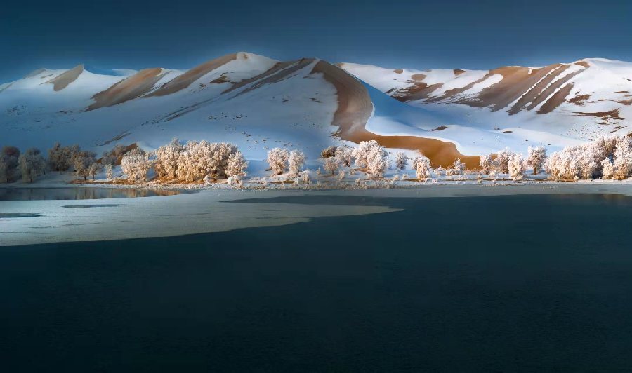 白雪、沙漠、湖泊、雾凇胡杨与蓝天相互映衬