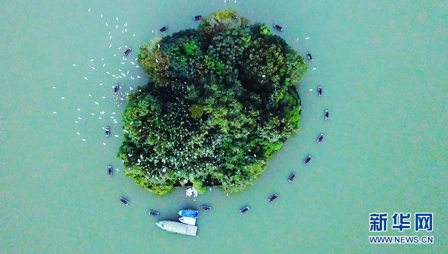 在肇庆星湖国家湿地公园,群鸟盘旋在一座小岛的上空。新华网发