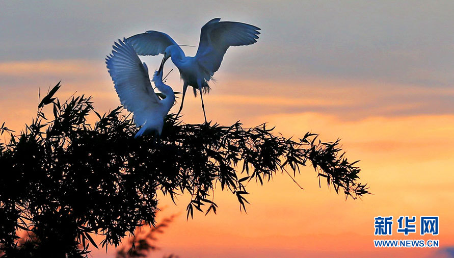 晨昏之际,林木静立,鸟儿飞翔啼鸣,美不胜收。新华网发(阮国志摄)