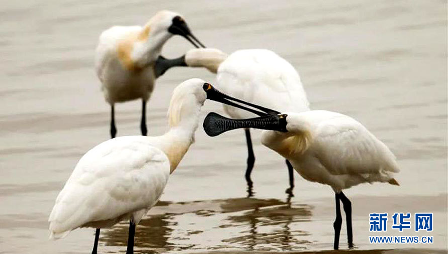几只黑脸琵鹭在深圳红树林自然保护区栖息。新华网发