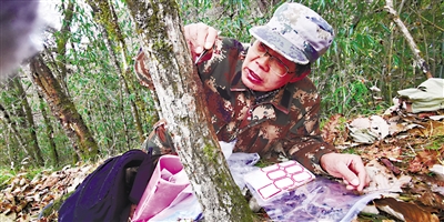 巡护员熊柏泉在调查熊猫发情期留下的标记。