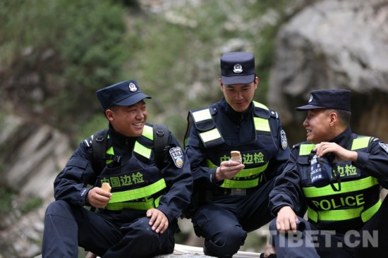 图为聂拉木出入境边防检查站友谊桥执勤点民警在巡逻休息的时候吃压缩饼干 摄影:尼玛旦增