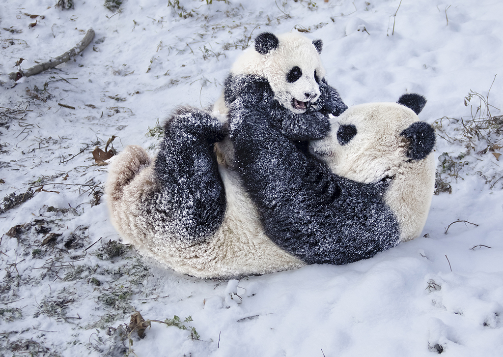 四川汶川:大熊猫雪中嬉戏打闹 又糯又奶