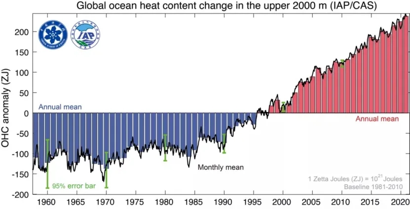 1958-2021年全球海洋上层2000米热含量变化时间序列(Chengetal ,2022)。图源报告