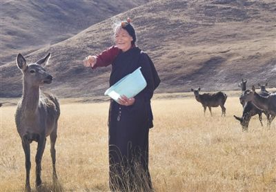 在西藏自治区昌都市类乌齐马鹿国家级自然保护区,藏族老阿妈向秋拉姆满脸慈爱,对着草山发出悠远的呼唤。不一会儿,成群的马鹿从山谷间围了过来。老阿妈把盐巴和芫根撒在地上,马鹿们尽情地享用了起来。15岁时,向秋拉姆偶然救助了3只受伤的野生马鹿。从此,每到秋冬季节,她都会在山脚下为马鹿准备好食物。转眼间,已经坚持了48年。