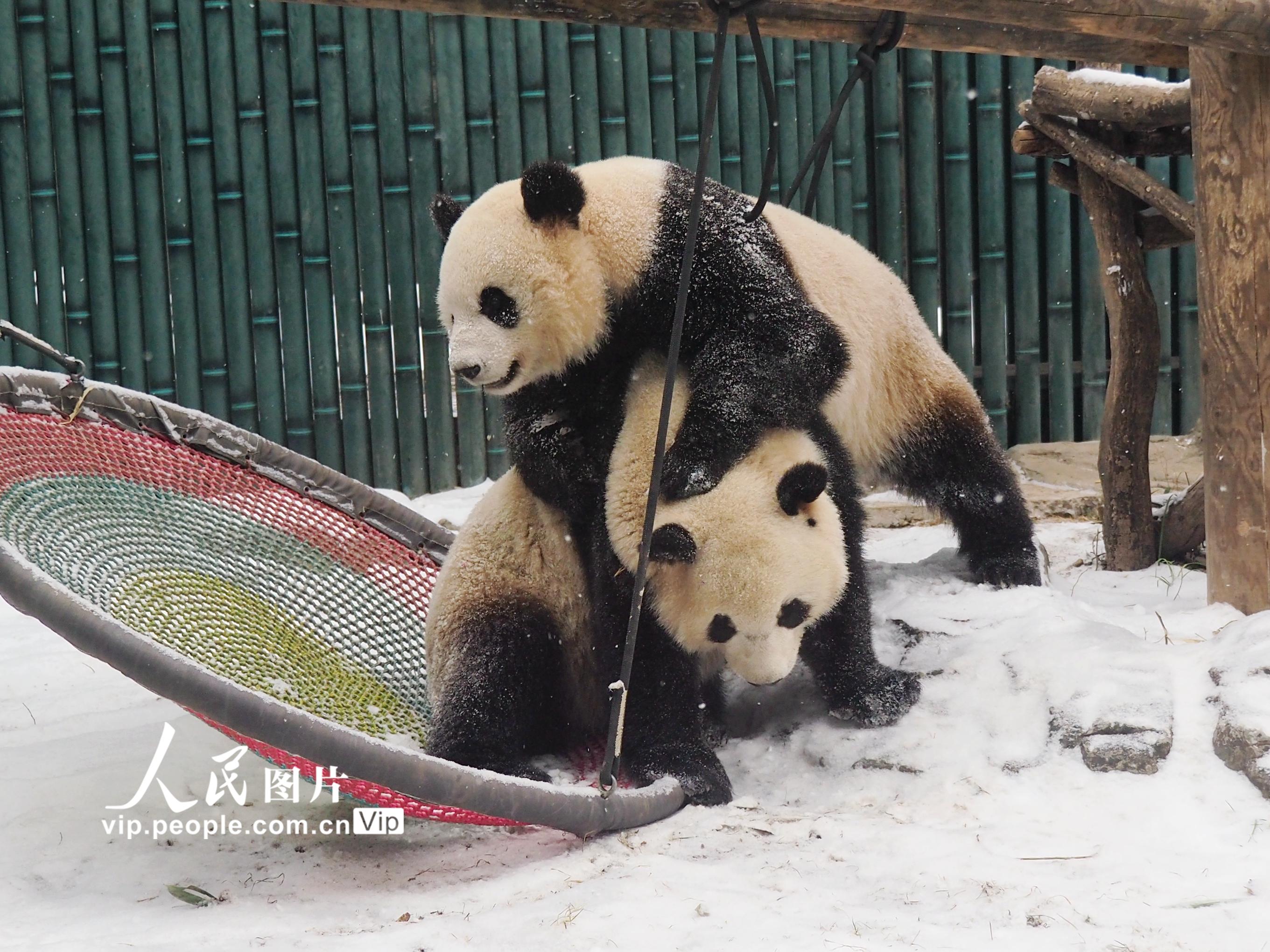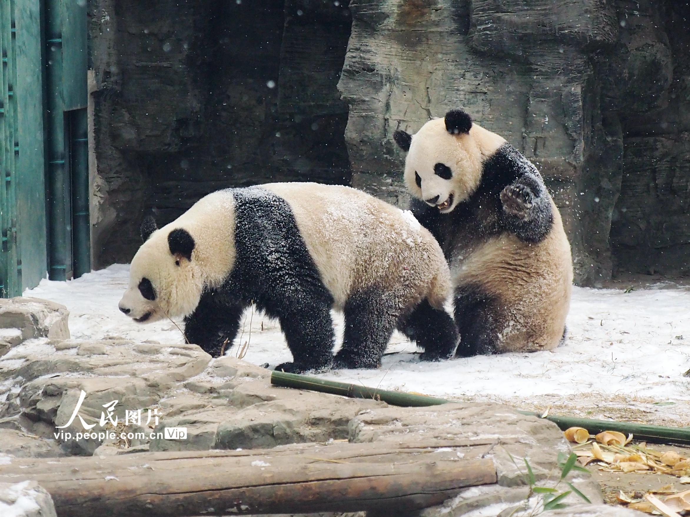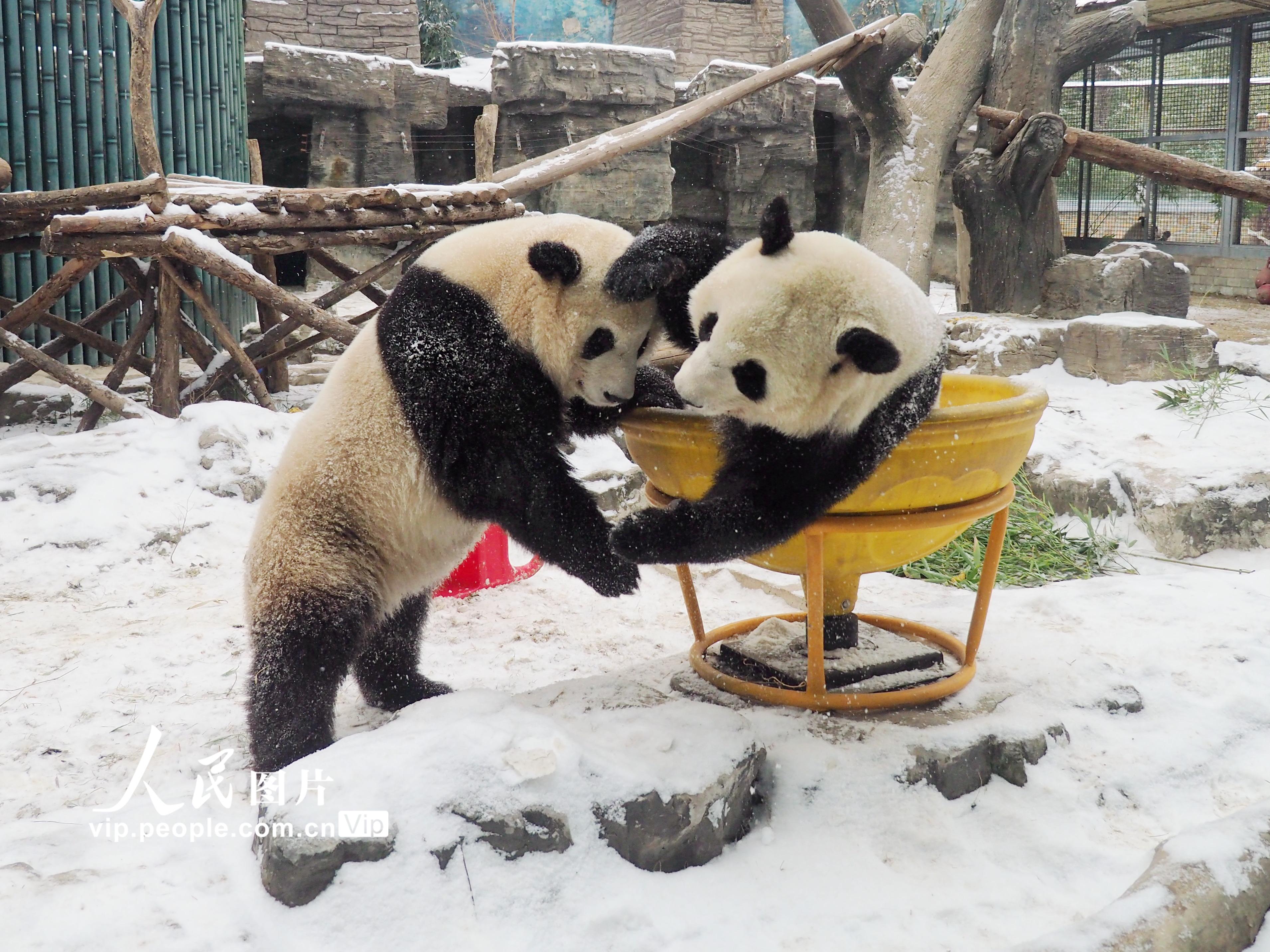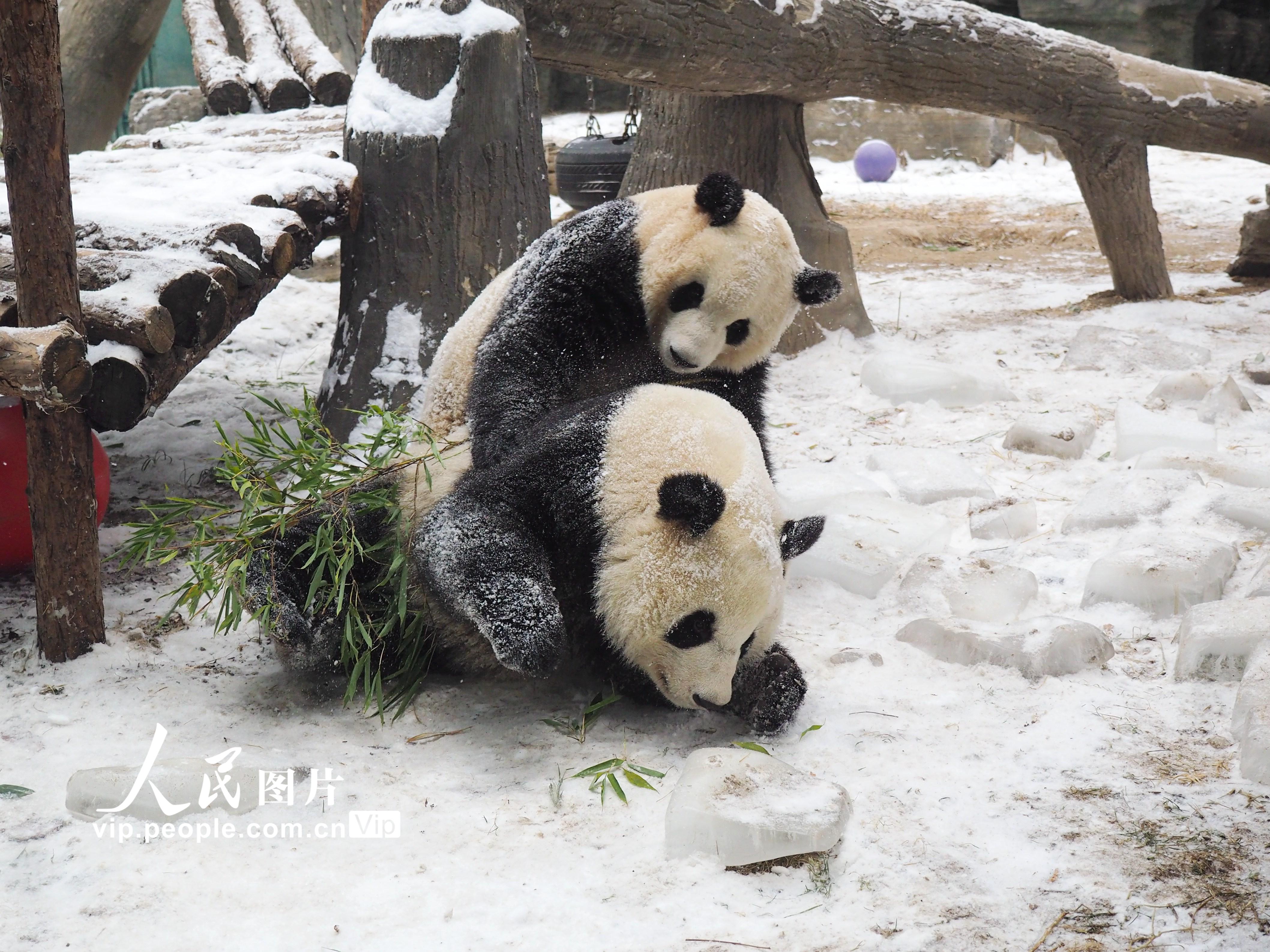 北京:大熊猫双胞胎姐妹雪地里嬉戏