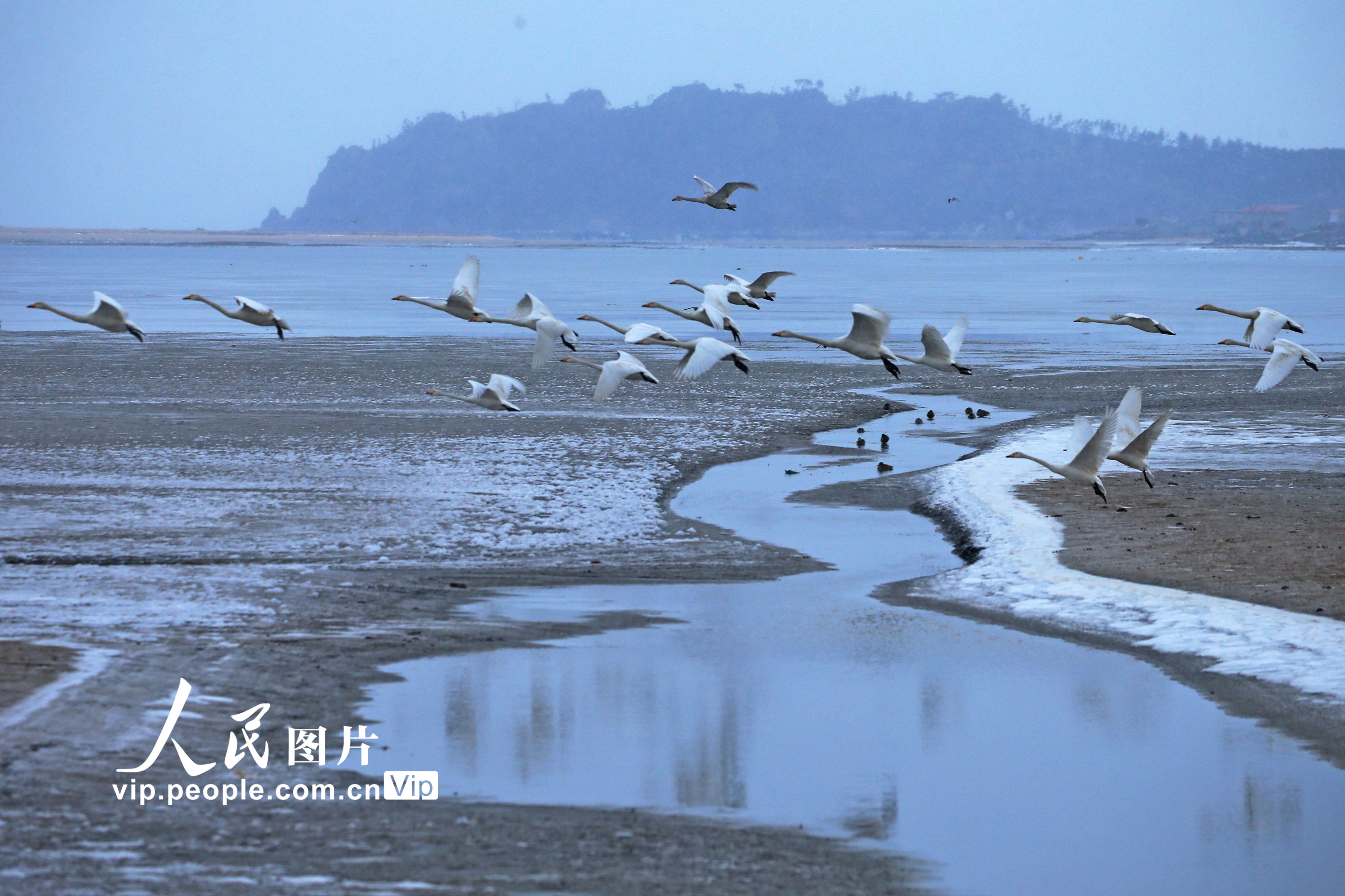 连日来,山东荣成天鹅湖迎来倒春寒天气,湖区不时飘落雪花,湖畔有结冰现象,在此栖息的大天鹅在春寒中飞舞,等待即将到来的迁徙季。王福东摄(人民图片网)