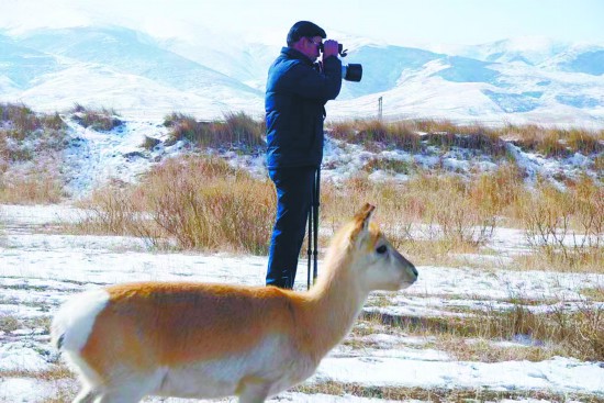 2月11日,吴永林正在和普氏原羚“东东”一起巡查。新华社记者 周盛盛 摄