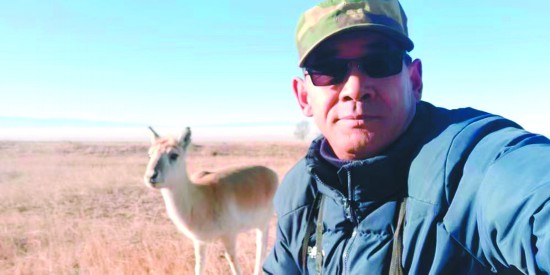 这是2月15日元宵节吴永林与普氏原羚“东东”的自拍照片。(受访者供图)
