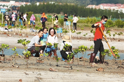 近日,在海南省三亚海棠区林旺社区铁炉村,党员干部和青年志愿者开展义务植树活动,在海边种下了数千株榄李、红海榄、海莲等5个品种的红树林树苗。三亚通过加快推进全市生态文明和森林城市建设,调动了全市人民植绿护绿的积极性。
