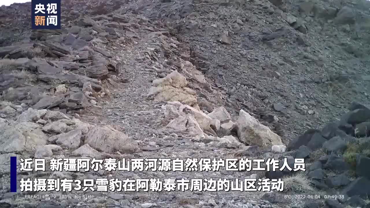 近日,新疆阿尔泰山两河源自然保护区的工作人员整理红外相机时,发现在阿勒泰市周边的山区拍摄到了3只雪豹活动的影像。