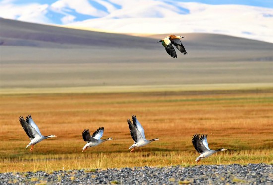 一只赤麻鸭(上)和一群斑头雁在保护区尼玛县那若塘湿地上飞翔。新华社记者张汝锋 摄