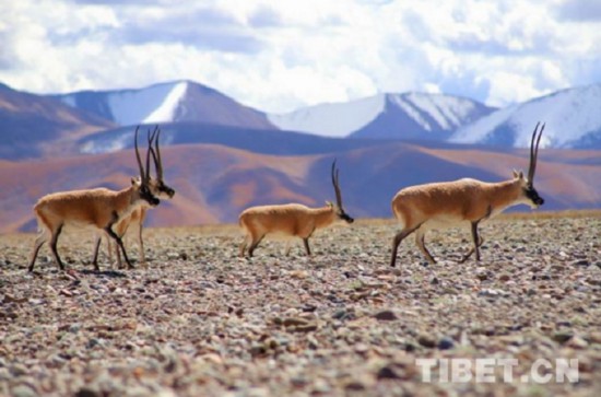 图为那曲市境内雪山下正在迁徙的藏羚羊 摄影:王鲁镇