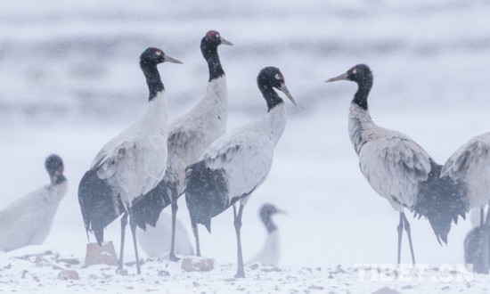 图为在拉萨市林周县虎头山水库附近越冬的黑颈鹤无忧无虑地觅食 摄影:赵耀