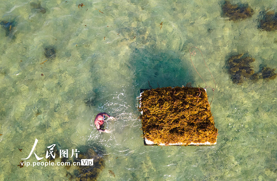 春夏之交的海南沿海等海域盛产“海多”(马尾藻的一种),这些海洋植物被海浪冲到沙滩上造成污染。近年来,琼海市沿海的渔民积极采集“海多”,晒干后远销山东、辽宁等地作为海胆、海参的养殖喂料。蒙钟德 摄(人民图片网)