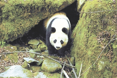 这只大熊猫被发现时身处沟道的石洞里。大熊猫发现工作人员后,并没有紧张害怕,只是在洞中不时晃晃脑袋,看看工作人员。大概过了10多分钟,走出石洞,沿着坡面向小山梁走去,消失在竹林中。