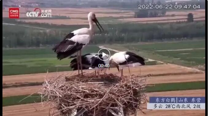 东方白鹳是国家一级重点保护动物,被誉为“鸟中国宝”,常在沼泽、湿地、塘边涉水觅食,主要以小鱼、蛙、昆虫等为食。在山东东营黄河三角洲,每年约有2000只东方白鹳在此筑巢繁殖,东营因此被誉为“中国东方白鹳之乡”。画面中的东方白鹳一家子,由“爸爸”“妈妈”和三只东方白鹳宝宝组成,在“爸爸”“妈妈”的精心呵护下,三只东方白鹳宝宝正茁壮成长。