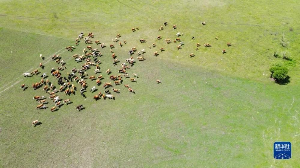 6月26日在内蒙古呼伦贝尔市新巴尔虎左旗古日班赛罕夏营地拍摄的牛群(无人机照片)。 新华社记者 贝赫 摄