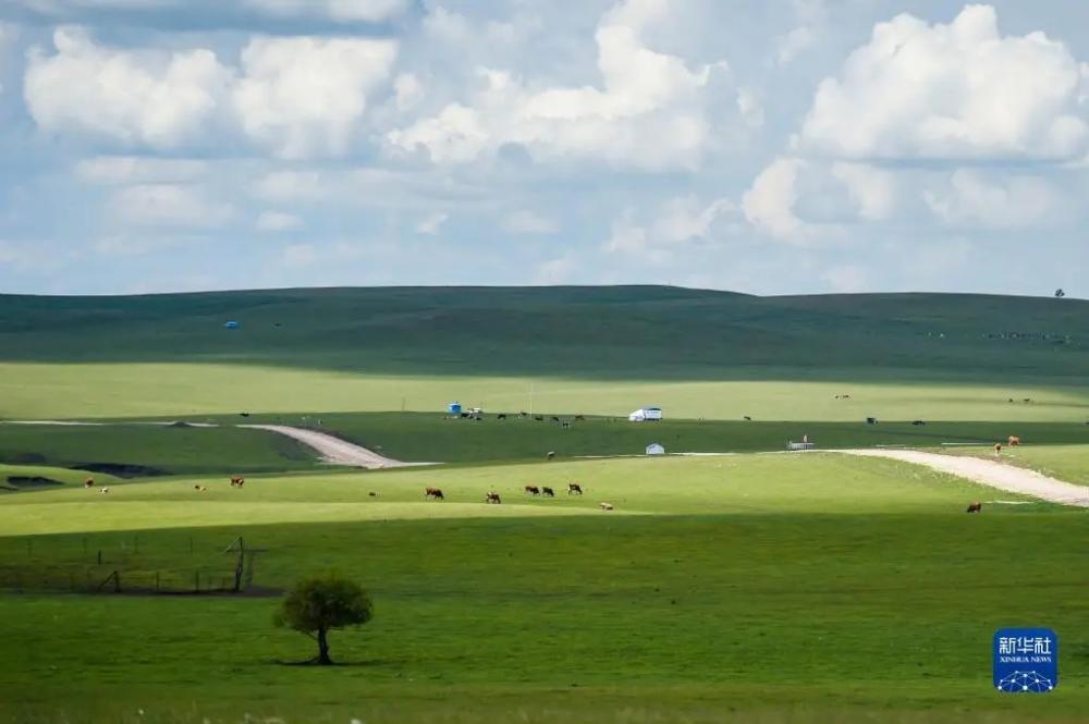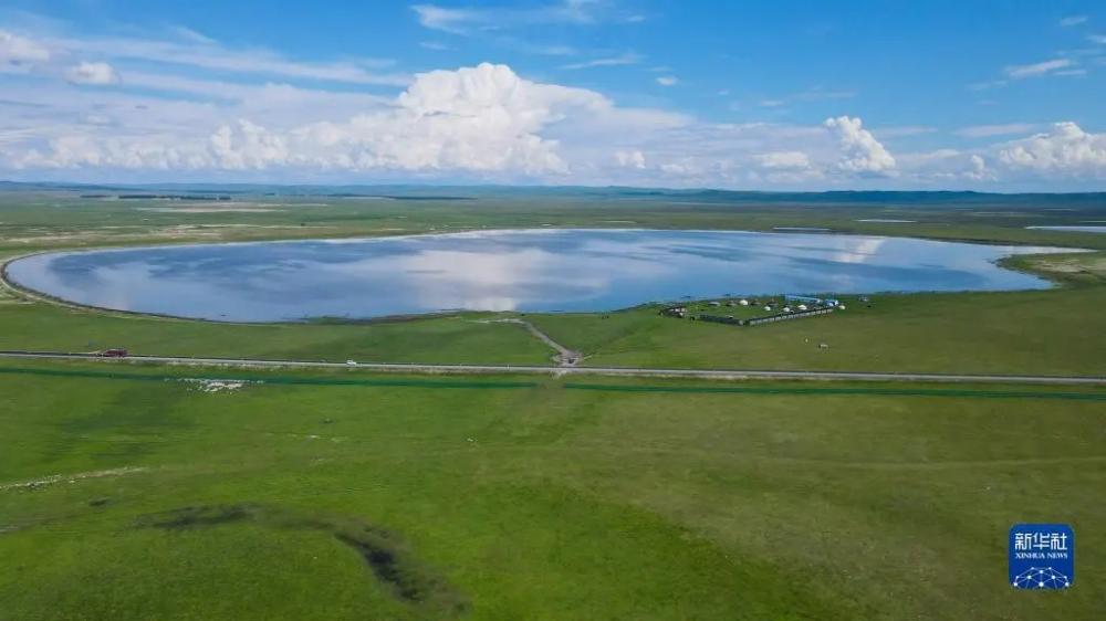 6月26日在新巴尔虎左旗道乐都夏营地拍摄的的夏日风光(无人机照片)。夏日里,位于内蒙古呼伦贝尔市新巴尔虎左旗的夏营地水草丰美、绿草如茵,迎来放牧黄金季节。 新华社记者 王泽聪 摄