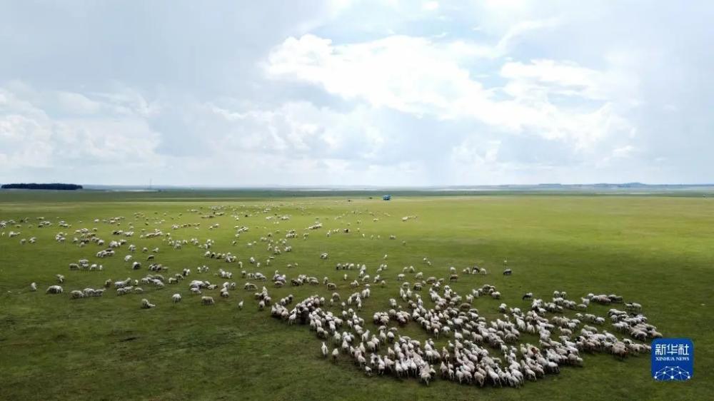 6月26日在内蒙古呼伦贝尔市新巴尔虎左旗道乐都夏营地拍摄的羊群(无人机照片)。 新华社记者 贝赫 摄