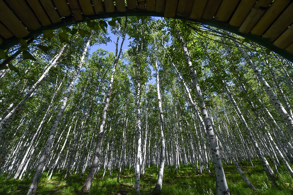 夏日里,位于内蒙古自治区呼伦贝尔市额尔古纳市的湿地与白桦林景色如画,引人入胜。