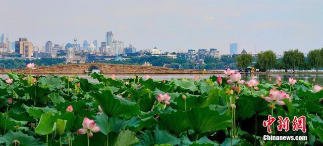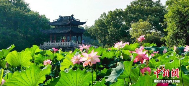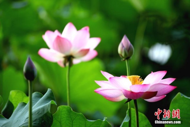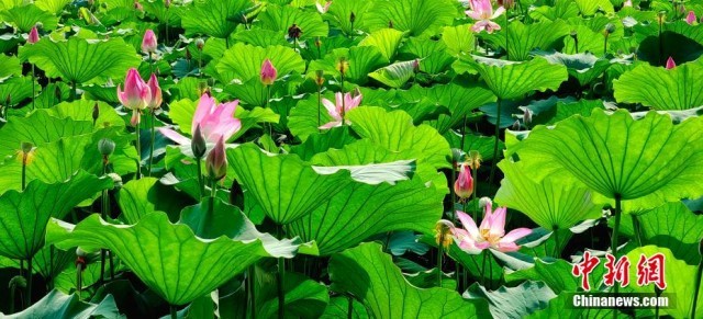 7月19日,浙江杭州西湖里,莲叶何田田,荷花已进入最佳观赏期。放眼望去,“接天莲叶无穷碧,映日荷花别样红”的景象尽收眼底。图为含苞待放和已盛开的西湖荷花。 江志清 摄