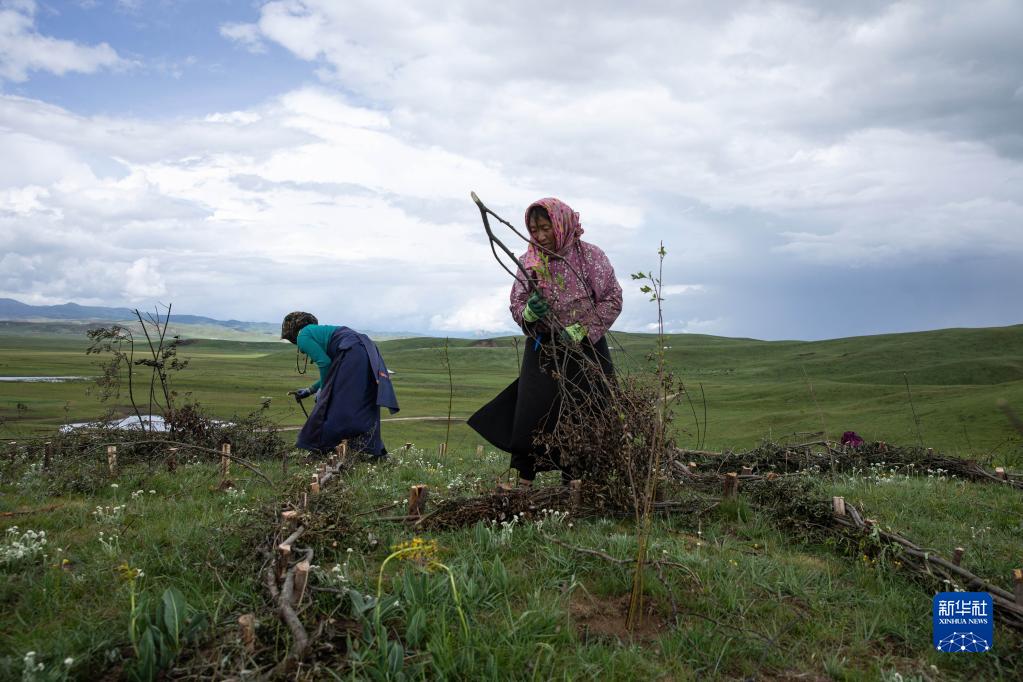 从五月底开始,四川省若尔盖县麦溪乡黑河村村民在当地政府组织下,抓住雨水季节的有利时机,在草场开展防沙治沙工作。