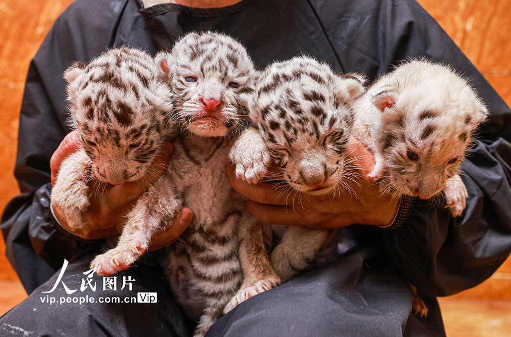 近日,山东省荣成市西霞口神雕山野生动物世界,一只雌性孟加拉白虎诞下四只虎宝,其中一只为珍稀雪虎,三只为孟加拉白虎。目前,虎宝们体征平稳,主食奶粉。