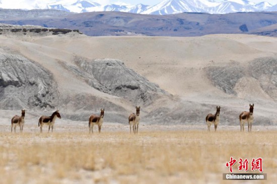 4月10日,西藏阿里地区札达县拍摄到的藏野驴。藏野驴为国家一级重点保护动物、青藏高原特有物种。藏野驴是我国野驴中体型最大的一种,外形与蒙古野驴相似,但要比蒙古野驴大许多,而且性格也比蒙古野驴凶悍。它的四肢和身体下侧,包括颈下方白色,耳朵内侧和口鼻端也是白色。在背脊上,一条深色条纹从鬃毛处一直延伸到尾端,尾巴上有一簇黑色细丝状的毛。近年来,随着西藏生态保护力度不断加大,藏野驴等多种野生动物频频亮相。