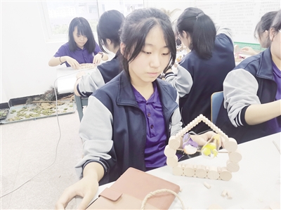 在现场,同学们先用胶水将准备好的树枝和小木头粘在一起,再用麻绳连接上,以方便将“驿站”悬挂在树上。通过自由想像,同学们制作出各式各样的“驿站”款式,为小鸟搭建温馨的家。